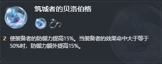 佩戴者的防御力增加15%。当佩戴者的效果命中大于等于50%时,防御额外增加15%。