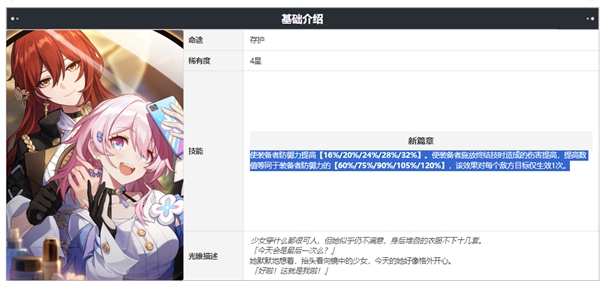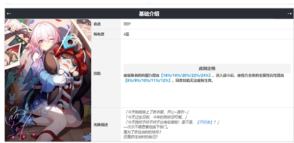 增加佩戴者的防御力[16%/18%/20%/22%/24%]。进入战斗后,所有友方全属性抗性增加[8%/9%/10%/11%/12%]。类似的技能不能重复使用。
