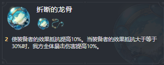使佩戴者的效果抗性提高10%。当佩戴者的效果抗性大于或等于30%时,所有队员的暴击伤害都会增加10%。