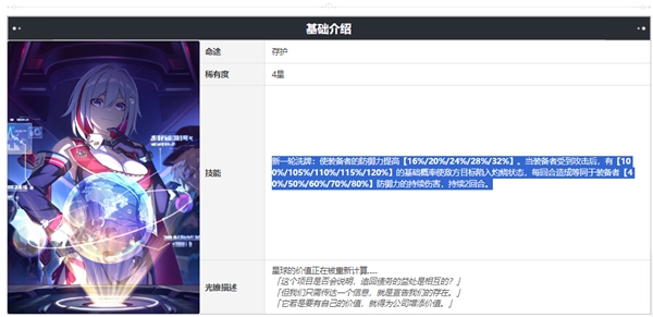 使佩戴者的防御力提高40%。当佩戴者为我们的目标提供护盾时,佩戴者的暴击伤害会增加40%,持续2回合。当佩戴者发动追加攻击命中敌方目标时,有100%的基础概率使被攻击的敌方目标受到的伤害增加10.0%,持续2回合。