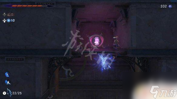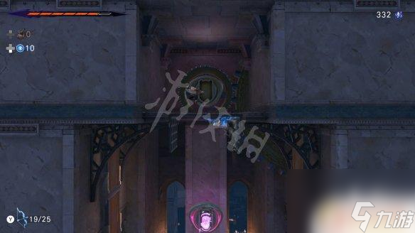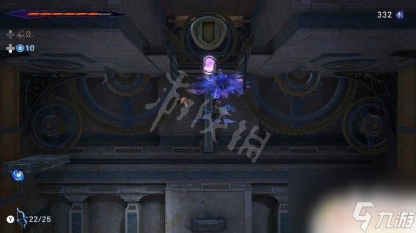 在小隔间留下残影,然后跳下去。掉落时用次元爪抓住电池,然后返回残像位置,将电池扔进插槽中。