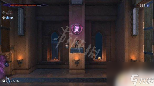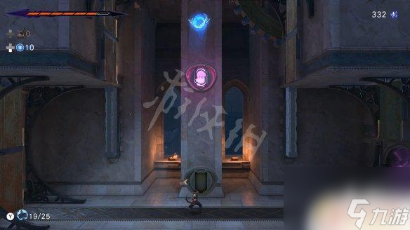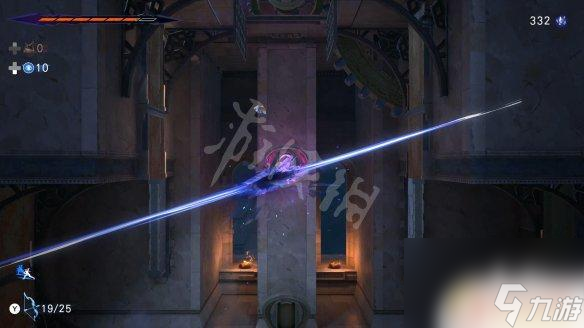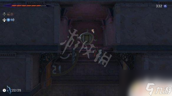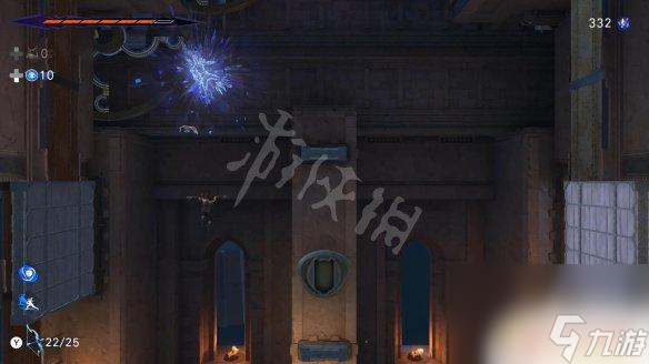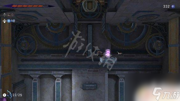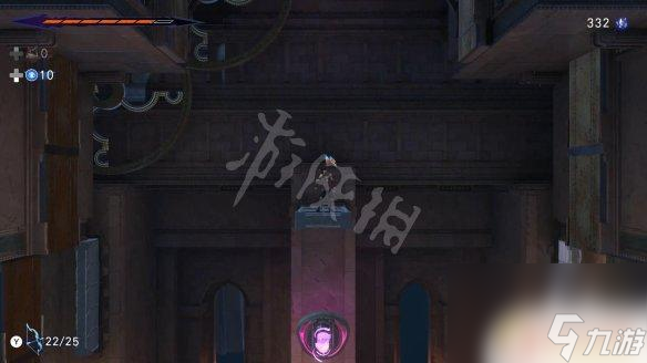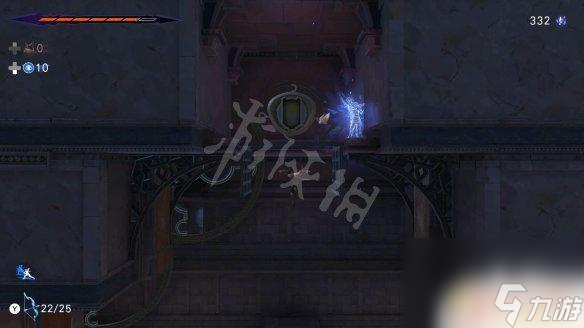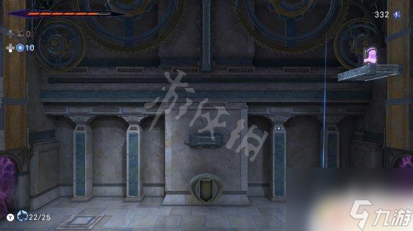 来到下层房间,站在右侧的地砖上。将电池平台移至右侧。当平台移动到最右边时,将环刃垂直向上抛出,然后传送到环刃位置并确保可以降落在炮台平台上。